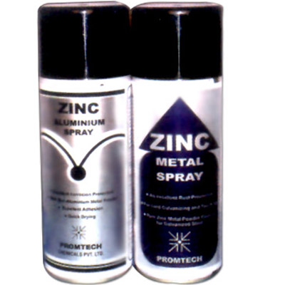 Promtech Chemicals provides cold galvanizing paints, zinc metal spray and zinc aluminum metal spray for touch up galvanizing for all hot dip galvanized surfaces. Zinc metal spray [light grey finish] and zinc aluminum metal spray [silver bright finish] are widely applicable in cold galvanizing spray paints for salvage/repairs and touch-up for all galvanized surfaces. These products offer ultimate corrosion resistance to the coated areas of mild steel fabrication and galvanized steel fabrication. The spray cans are available in 400 ml self-spray aerosol cans, which are extremely user friendly, require minimum skills to operates, totally CFC free andvery safe to environment , confirming to most Indian and international specifications requirements. The aerosol can has a shelf life of one year andcan be used multiple times when used as per the instructions. The spray covers 2 sq.m area and offers 18-20 microns of zinc metal powder coating on the surface. The surface to be coated shall be free from water, moisture, rust, dirt and dust, oil and grease