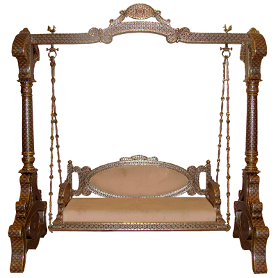 Kapasi Handicrafts Emporium offers German Silver made Enameled Swing. Kapasi Handicrafts Emporium also offers various types of temple, swing, paintings, office collections, garments etc. The German Silver made Enameled Swing has fine polish and finishing with maroon minakari/ enameled carvings. The German silver made Enameled Swing has German silver chains. The German silver made Enameled Swing is available in Length, Breath and Height 208 X 99 X 216 centimeters.