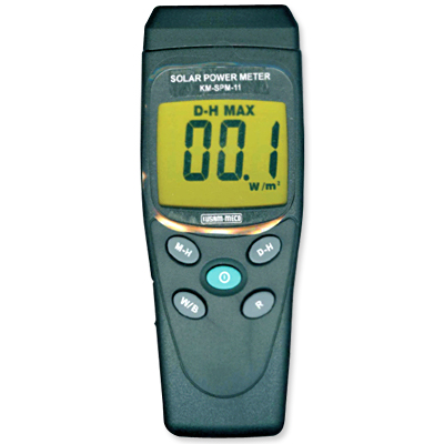 Light Sensor based Solar Power Meter is a device used to measure solar power by aim its opening at the sun. The Solar Power Meter model number KM-SPM-11 is designed with End-mount light sensor and enables selection of either power or transmission. The Solar Power Meter is capable of measuring light source including all visible light sources. The Light Sensor based Solar Power Meter is provided with backlight display and ensures stability for long time use.