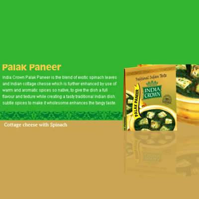 Ready to Cook Palak Paneer is manufactured by White Fields International Pvt. Ltd. White Fields International Pvt. Ltd. is an ISO 9001:2008 and ISO 22000:2005/ HACCP certified company that offers premium quality Basmati Rice and Ready to Eat Products under the brand name "India Crown".