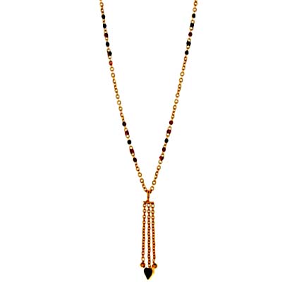Stylevati Bhava manufactures Three Line Mangalsutra with Single Round Antique Twisted Pendent at the Centre. Stylevati Bhava is an ISO 9001:2000 certified company. The Three Line Mangalsutra with Single Round Antique Twisted Pendent at the Centre is a single delicate gold chain with black and red enamel. This product weighs 3.31 gm and its length is 15 inches. This Single Length Mangalsutra with Small Heart Pendant is 22K Yellow Gold made.