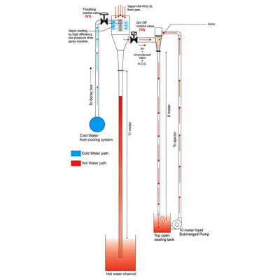 Split Function Condensing System consumes 50% water in the single entry condenser. The Condensing System is provided with high efficiency low pressure drop spray nozzle. The Condensing System has external ejector installed outside the condenser to pull out uncondensed vapour. The Split Function Condensing System consumes less power and brings down water load on cooling system.